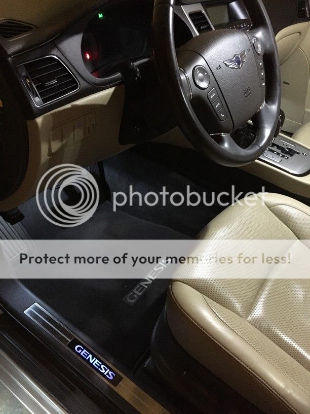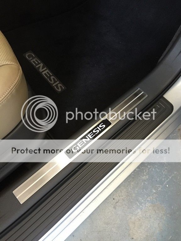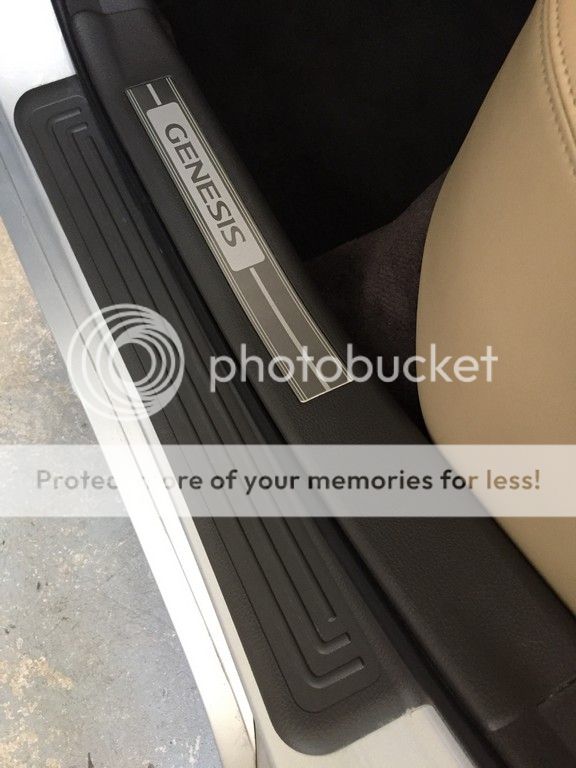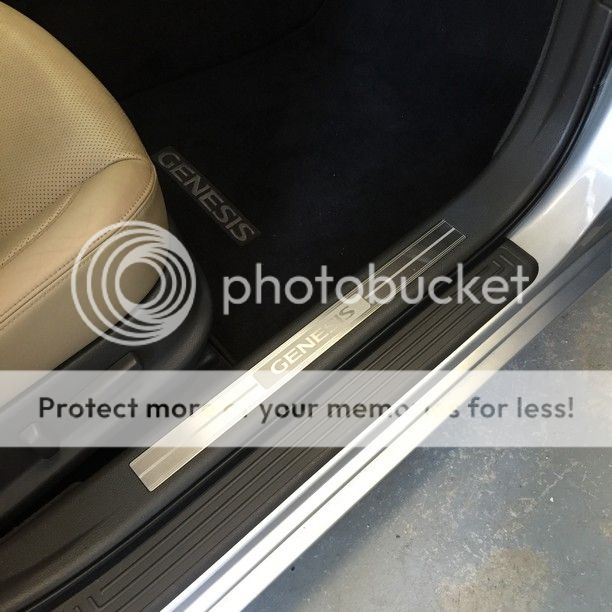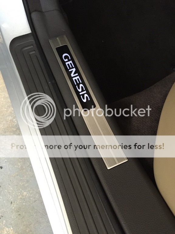 Interesting photo above. I have the cashmere interior with the dark brown cocoa carpeting. My OEM, but add-on sills are black, not light beige, around the Genesis name. ????